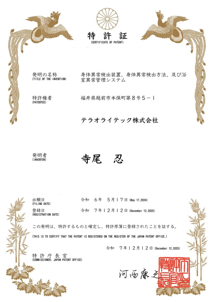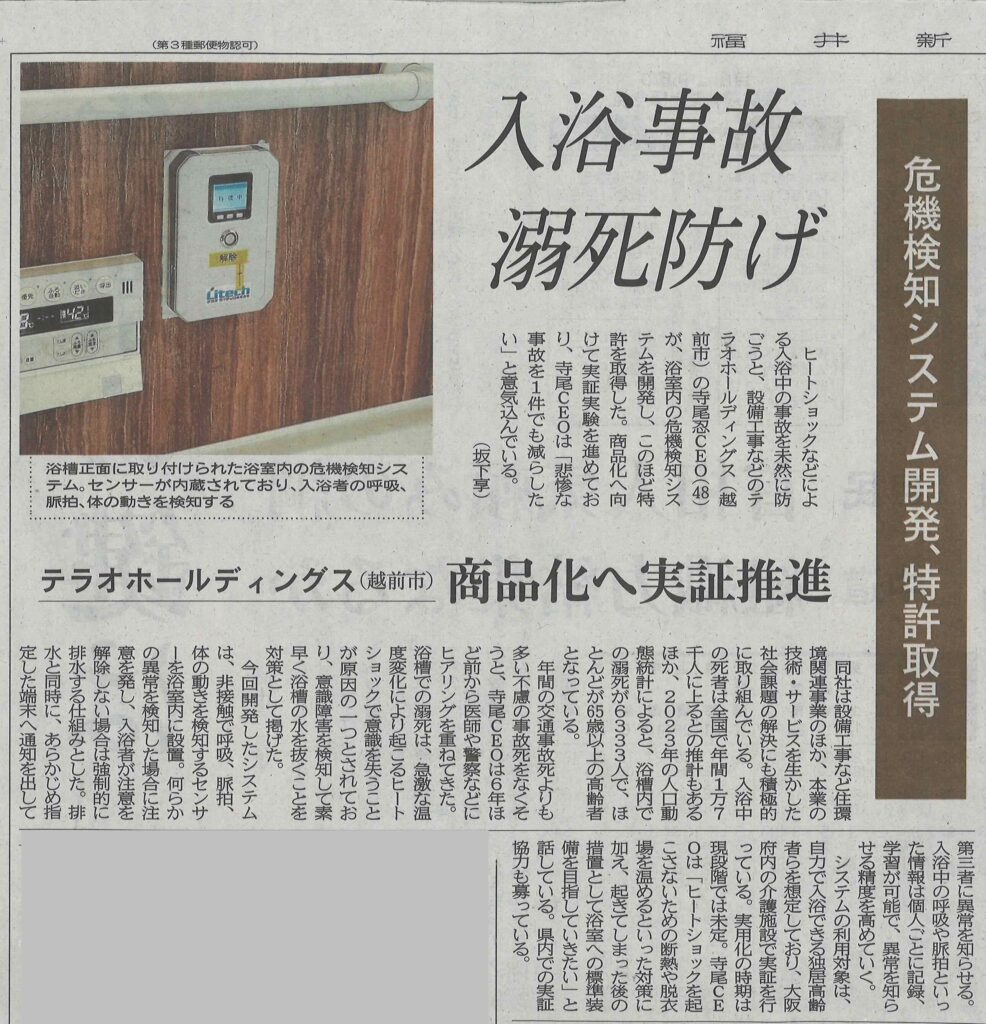 2026年1月28日「福井新聞」掲載 弊社代表 寺尾忍がヒートショックなどによる入浴中の事故を未然に防ぐため、浴室内の危機検知システムを開発し、このほど特許を取得しました。 危機検知システムを詳しくみる >
